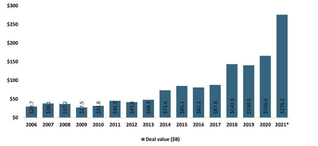 To see this graphically, look at the chart below (again, using Pitchbook data). I took the annual overall deal value in Q1 and simply annualized it and chart it in comparison to the last 15 years. At a more granular level, the quarterly data shows that the climb in deal value has been dramatic since the pandemic.