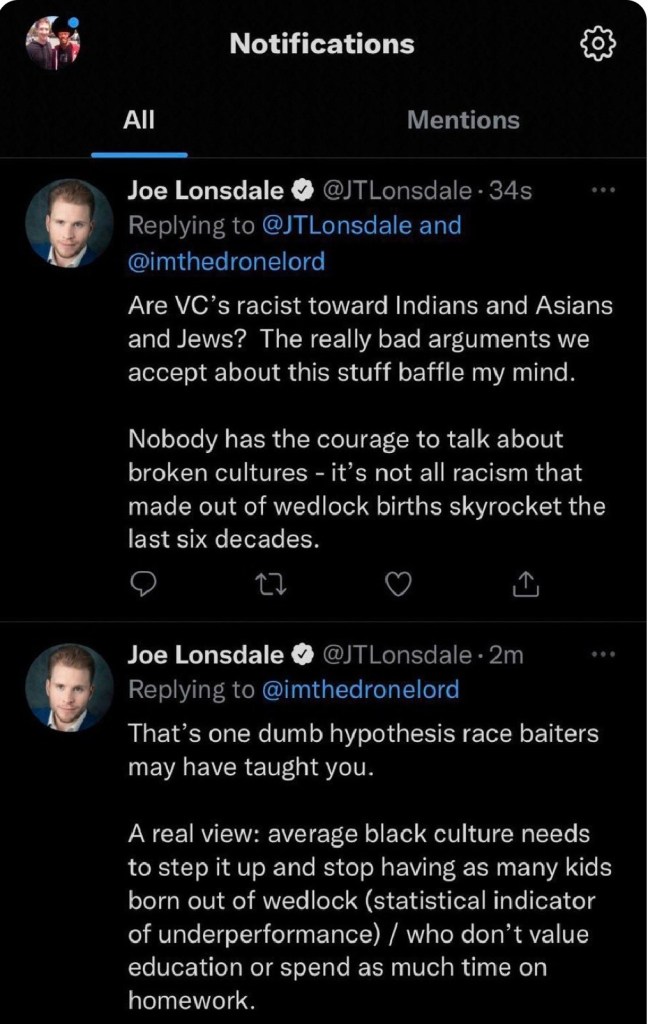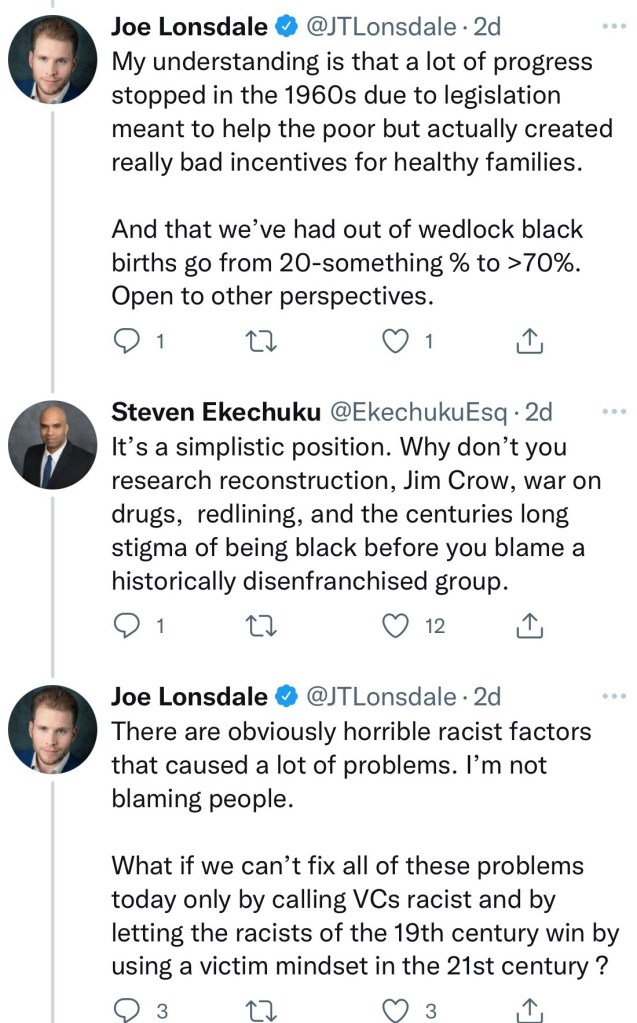 Lonsdale later deleted that tweet but followed it up with another two that I’ll include here in response to a thoughtful reply from Steve Ekechuku, a NY-based lawyer: