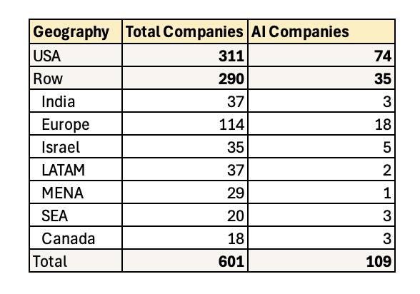 Once again, I want to profusely thank my numerous VC friends situated in startup hubs around the world for their input — including those in Canada (11 companies), Europe (92 companies), India (42 companies), Israel (31 companies), LatAm (32 companies), MENA (featured for the first time! 18 companies), and Southeast Asia (18 companies). Pitchbook is an amazing source of insight but there tends to be less reliable data outside the US.